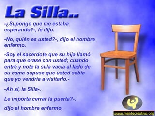 El sacerdote visita a un hombre enfermo a pedido de su hija. El hombre le cuenta que ha estado orando solo imaginando que Jesús está sentado frente a él durante dos horas diarias por los últimos cuatro años. Dos días después, la hija informa que el hombre murió pacíficamente con la cabeza recostada en la silla vacía junto a su cama. El sacerdote cree que esto significa que Jesús vino a buscarlo.