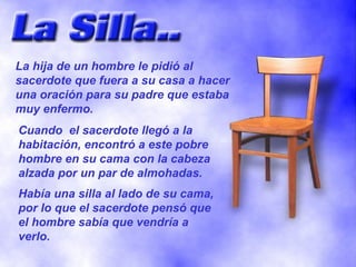 El sacerdote visita a un hombre enfermo a pedido de su hija. El hombre le cuenta que ha estado hablando con Jesús sentado en una silla vacía a su lado durante horas cada día por los últimos cuatro años. Dos días después, la hija informa que el hombre murió pacíficamente con la cabeza recostada en la silla vacía. El sacerdote cree que esto significa que Jesús vino a buscarlo.