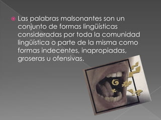 Las palabras malsonantes son formas lingüísticas consideradas groseras y ofensivas, que no deben usarse para insultar o menospreciar a otros. A pesar de su inadecuación, se emplean en ciertos contextos sociales, a menudo para expresar desprecio o enojo. Es importante ser un buen ejemplo, especialmente en el ámbito familiar, evitando el uso de estas palabras para prevenir problemas y malos entendidos.