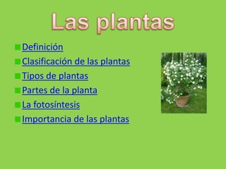 Este documento resume las características y la importancia de las plantas. Define las plantas y explica su clasificación, partes y proceso de fotosíntesis. Las plantas se clasifican según su tamaño y método de reproducción. Realizan la fotosíntesis para producir su alimento y proveen oxígeno y alimentos a los seres humanos.
