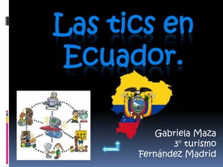 El documento describe las tecnologías de la información y la comunicación (TIC) en Ecuador. Explica que las TIC permiten transmitir, procesar y difundir información de manera instantánea y son fundamentales para reducir la brecha digital. También detalla las ventajas de las TIC para la comunicación, la innovación, la cooperación y el acceso a la información. Finalmente, discute la importancia de capacitar a los docentes en el uso de las TIC para mejorar la calidad de la educación en Ecuador.