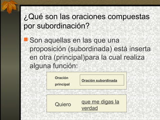 Este documento explica los tres tipos principales de oraciones compuestas por subordinación: sustantivas, adjetivas y adverbiales. Define cada una y proporciona ejemplos para ilustrar cómo identificarlas y cuál es su función. También incluye ejercicios para que el lector practique reconocer y analizar estas oraciones compuestas.