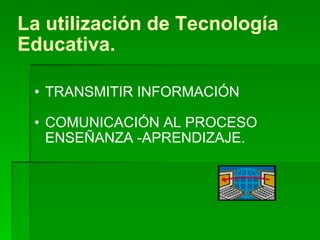 El documento describe la tecnología educativa como un conjunto de técnicas y métodos que utilizan medios para transmitir información y apoyar el proceso de enseñanza-aprendizaje. La tecnología educativa se desarrolla en áreas como el diseño curricular, los métodos de enseñanza y aprendizaje, y los contenidos y materiales de apoyo como videos y diapositivas. Su objetivo es superar la calidad de la enseñanza cara a cara mediante la comunicación, la innovación, la cooperación e investigación.