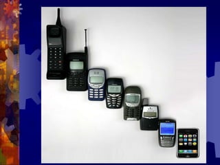 El documento resume la historia y evolución del teléfono celular desde su origen en la Segunda Guerra Mundial hasta modelos modernos. Explica que el primer teléfono celular fue creado por Motorola en 1940 y que desde entonces los teléfonos han ido reduciendo de tamaño hasta caber uno dentro del otro como muñecas matrioskas. También destaca algunas ventajas como la comunicación a distancia y entretenimiento, pero también desventajas como la adicción y efectos en la salud.