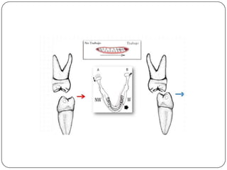 La lateralidad de la mandíbula se refiere al movimiento de la mandíbula hacia un lado, ya sea derecha o izquierda. En la lateralidad, solo los caninos del lado hacia el que se mueve la mandíbula, conocido como el lado de trabajo, entran en contacto, mientras que el resto de las piezas dentales en el lado opuesto, conocido como el lado de balanceo, no entran en contacto. También es posible que los caninos y premolares posteriores del mismo lado entren en contacto durante la lateralidad.