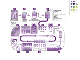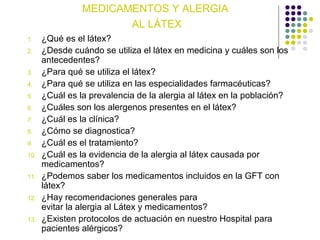 Este documento resume información sobre medicamentos y alergia al látex. Explica que el látex se utiliza en guantes, catéteres y otros materiales médicos debido a su flexibilidad y resistencia. La prevalencia de alergia al látex varía de 0.5-25% dependiendo de la población. Se diagnostica mediante pruebas cutáneas e IgE séricas. El tratamiento incluye protocolos para evitar el látex y el manejo de reacciones de hipersensibilidad. La alergia a medicamentos por látex es rara