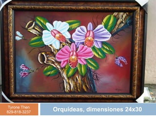 El documento lista los nombres, dimensiones y números de contacto de varias pinturas y lámparas colgantes disponibles del artista Tyrone Then. Las pinturas incluyen paisajes, bodegones y retratos de varios tamaños. Las lámparas están hechas de vidrio o caoba o una combinación de ambos materiales. Se proporciona el número de teléfono de Tyrone Then para obtener más información.