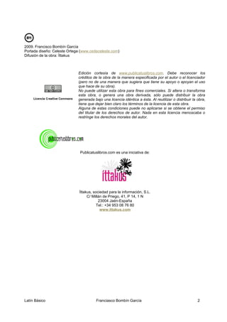 Este documento presenta un resumen de un libro de latín básico. Explica que el objetivo del libro es mostrar cómo funciona la lengua latina y cómo influyó en el desarrollo del español. Incluye información sobre la pronunciación y acentuación del latín, las declinaciones, los temas verbales, y ejemplos de vocabulario con sus derivados en español. El documento contiene preguntas de comprensión sobre los textos.