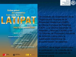El documento describe el proyecto LATIPAT, una iniciativa de cooperación entre la OMPI, la OEP y las oficinas de propiedad intelectual de América Latina para publicar documentación de patentes de forma electrónica. El proyecto busca poner a disposición información de patentes de la región e intercambiar datos entre oficinas para facilitar el acceso al conocimiento tecnológico. Actualmente 18 países participan activamente cargando datos bibliográficos y documentos completos al servidor LATIPAT.