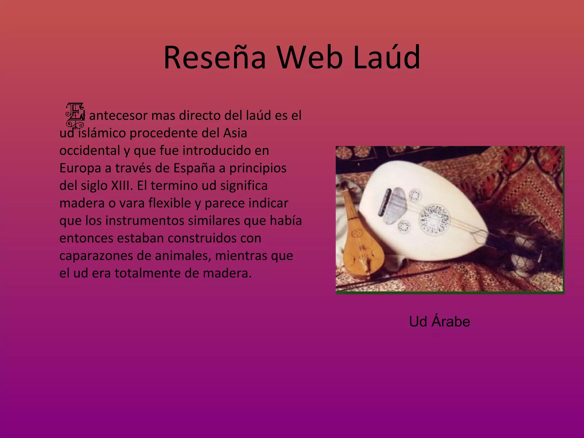 El laúd evolucionó a partir del ud árabe introducido en Europa en el siglo XIII. A lo largo de la Edad Media y el Renacimiento, la forma del laúd cambió admitiendo diferentes tamaños y ornamentaciones, pero manteniendo su diseño básico de cuerdas pulsadas. En el Renacimiento, el laúd alcanzó su perfección estructural y de fabricación. Durante los siguientes 500 años, el laúd sufrió numerosos cambios estructurales y estilísticos, incluyendo variaciones en el número de órden