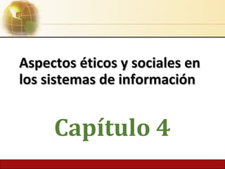 Este documento discute los aspectos éticos y sociales de los sistemas de información. Aborda problemas como el contenido pirata en Internet y las soluciones propuestas. Explica que los sistemas de información crean nuevos retos éticos al ocasionar cambios sociales y nuevos tipos de crímenes. Identifica cinco dimensiones morales clave relacionadas con los derechos sobre la información y propiedad, la rendición de cuentas, y la calidad e impacto de los sistemas de información en la sociedad.