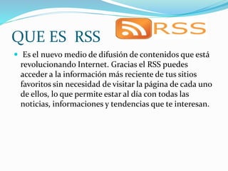 Este documento explica qué es RSS y cómo se puede usar. RSS permite a los usuarios acceder fácilmente a las últimas actualizaciones y noticias de los sitios web a los que están suscritos sin tener que visitar cada sitio individualmente. Los lectores RSS facilitan la gestión y publicación de información en los sitios web y brindan a los lectores un ahorro de tiempo al poder ver rápidamente las últimas actualizaciones de varios sitios en un solo lugar. El documento describe diferentes tipos de lectores RSS y cómo instalar y usar uno.