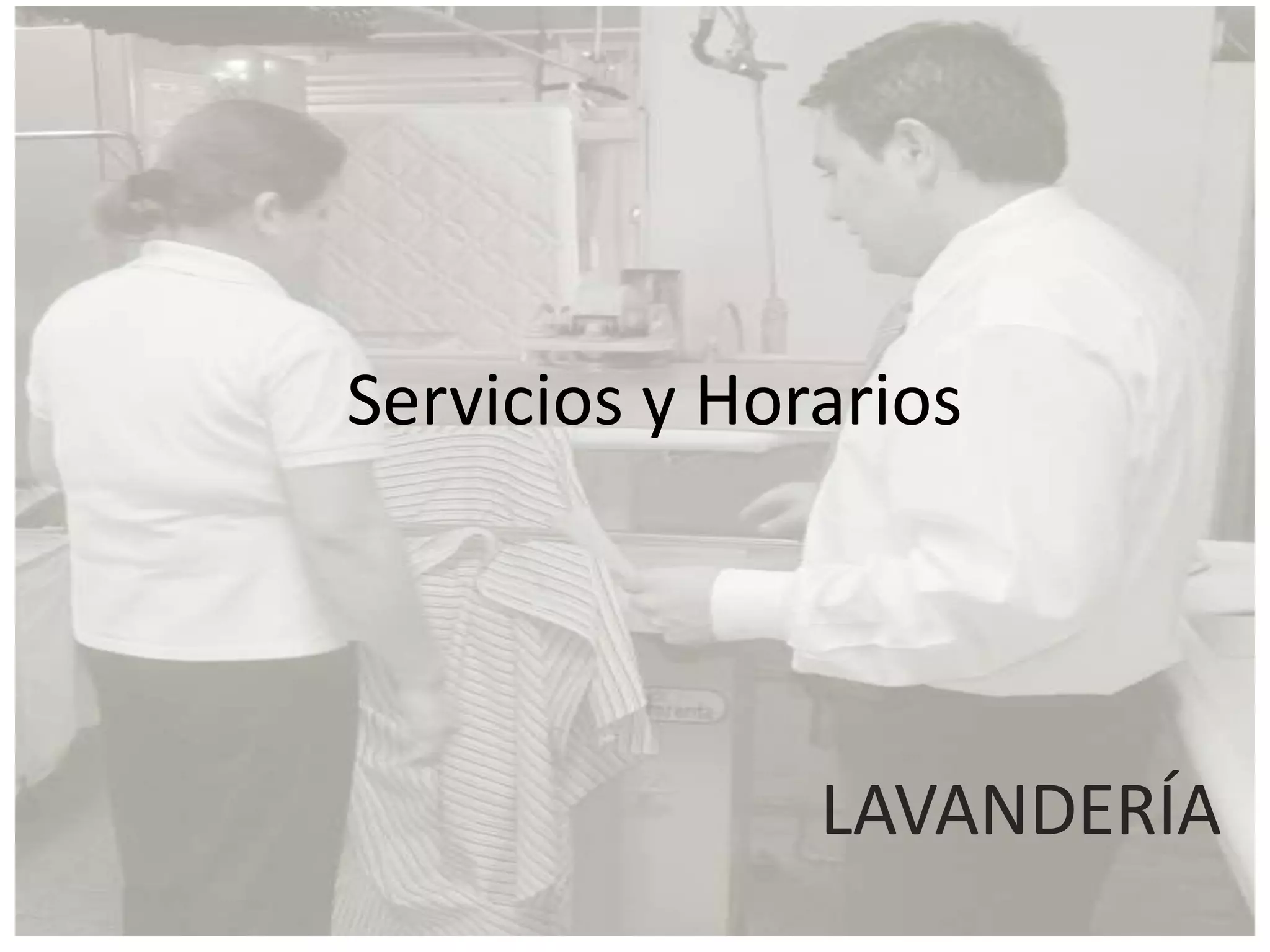 El documento detalla los horarios y servicios de lavandería de un hotel. La lavandería opera de 7 am a 10 pm todos los días. Ofrece servicios regulares de lavado antes de las 10 am y servicios express con un recargo del 50% entre las 10 am y 3 pm. Los fines de semana y festivos, el servicio express tiene precios más altos. También cubre casos excepcionales como lavados y planchados urgentes, costuras y desmanches.