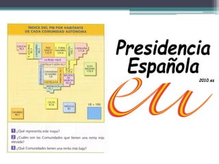 Este documento presenta una introducción a la Unión Europea. Explica el proceso de creación de la UE a través de tratados como el de Roma y Maastricht. Describe las principales instituciones de la UE como el Consejo Europeo, el Parlamento Europeo y la Comisión Europea. También resume los objetivos de la UE, su política regional, y la ampliación del bloque a nuevos países miembros.