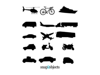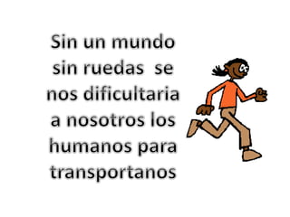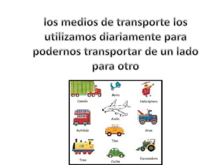 El documento lista varios medios de transporte terrestres como caminar, cabalgar, esquiar, patines y trineos, así como vehículos como autos, autobuses, camiones, busetas, excavadoras, grúas, remolques y tractores. También incluye medios de transporte ferroviarios y fluviales como ferrocarriles, tranvías, funiculares, monorrieles, super trenes, barcos de vapor, canoas, botes, galeras y veleros. Por último, menciona varios tipos de aeronaves como globos