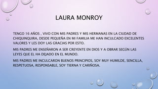 Laura tiene 16 años y vive en Chiquinquirá con sus padres y hermanas. Su familia le ha inculcado valores como la humildad, respeto y responsabilidad. Es muy unida a su gran familia, que la apoya incondicionalmente. Sus pasatiempos favoritos incluyen escuchar música, dormir, comer, bailar y pasar tiempo con su familia y amigos. Sus metas son graduarse de bachiller con honores, obtener un título en ingeniería ambiental para servir a la sociedad, y convertirse en el orgullo de su