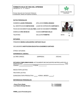 Este documento presenta un formato de hoja de vida para un aprendiz que incluye secciones para datos personales, estudios, experiencia laboral, estudios complementarios, fechas de inicio y fin de la etapa lectiva, duración de la etapa productiva, y referencias personales. El formato proporciona un modelo estandarizado para recopilar información relevante sobre el aprendiz y su formación.