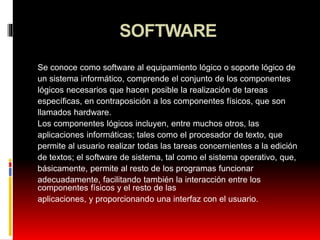 El documento habla sobre software. Define software como el equipamiento lógico de un sistema informático que incluye aplicaciones como procesadores de texto y sistemas operativos. Clasifica el software en tres categorías: software de sistema, software de programación y software de aplicación. También discute conceptos como aplicaciones portátiles, archivadores de ficheros y sistemas de gestión de paquetes.