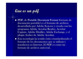PDF es un formato de archivo desarrollado por Adobe para preservar la presentación de documentos independientemente del hardware o software. Permite capturar texto, imágenes y otros contenidos de varias aplicaciones en un formato universal que puede verse y editarse en cualquier sistema operativo. El formato PDF se ha convertido en un estándar para el intercambio de documentos en Internet y la industria editorial debido a su capacidad multiplataforma y portabilidad.