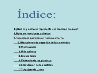 Este documento resume diferentes tipos de reacciones químicas y varias reacciones importantes que ocurren en nuestro entorno. Explica que una reacción química involucra la transformación de reactivos en productos, y cómo se representan las ecuaciones químicas. Luego describe tipos comunes de reacciones como formación, descomposición, desplazamiento e intercambio. Finalmente, resume reacciones como la digestión, fotosíntesis, pilas químicas, lluvia ácida y oxidación de metales, y cómo