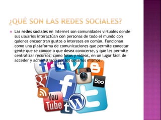 El documento habla sobre las diferentes clasificaciones de redes sociales digitales, incluyendo redes sociales generales, profesionales y de geolocalización. Luego describe brevemente las características y funciones de algunas redes sociales populares como Facebook, Twitter, WhatsApp, Snapchat e Instagram.