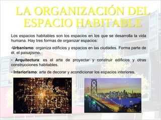 Este documento describe los tres tipos principales de organización de espacios habitables: urbanismo, arquitectura e interiorismo. Explica que el urbanismo organiza los edificios y espacios de las ciudades, la arquitectura se enfoca en el diseño y construcción de edificios, e interiorismo en decorar y acondicionar espacios interiores. También describe conceptos clave como el trazado urbano, elementos del lenguaje arquitectónico como forma, color y textura, y factores importantes para la distribución y habitabilidad de espac