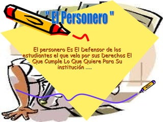 El documento habla sobre el personero y el contralor de una institución educativa. Explica que el personero debe defender los derechos de los estudiantes y cumplir con sus promesas, mientras que el contralor es responsable de garantizar que el dinero de la institución se gaste correctamente y en las necesidades adecuadas. Ambos roles deben mantener informados a los estudiantes y asegurarse de que cumplen con sus deberes.