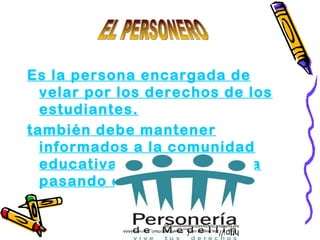 El documento habla sobre los roles y responsabilidades de un personero y un contralor estudiantil. Un personero debe velar por los derechos de los estudiantes y mantener informada a la comunidad educativa. Un contralor debe observar cómo se gasta el dinero de la institución y asegurarse de que se use correctamente. Ambos deben hacer propuestas realistas que puedan cumplir y no comprar votos.