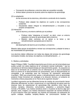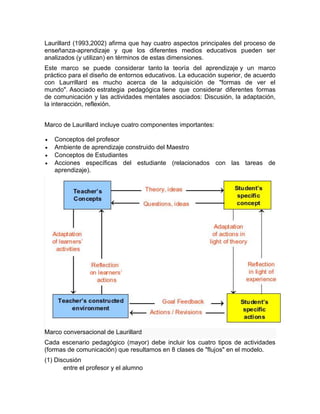 El marco de Laurillard describe cuatro dimensiones del proceso de enseñanza-aprendizaje y cómo diferentes medios educativos pueden analizarse y utilizarse en función de estas dimensiones. Incluye cuatro componentes clave: los conceptos del profesor, el entorno de aprendizaje creado por el profesor, los conceptos del estudiante y las acciones específicas del estudiante. El marco también describe ocho tipos de "flujos" entre estas dimensiones a través de la discusión, la adaptación, la interacción y la reflexión.