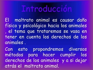 Este documento trata sobre el maltrato animal y propone formas de hacer cumplir los derechos de los animales. El maltrato animal causa daño físico y psicológico a los animales. El objetivo es empezar a proyectar un cambio sobre el maltrato animal, informar a las comunidades sobre la situación de los animales, y evitar que desaparezcan. El maltrato animal es un crimen legalizado que ocurre en muchos países y lugares como circos y experimentación. Se proponen denuncias y no apoyar lugares que