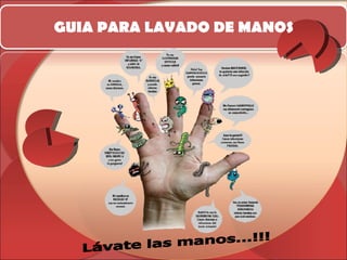 Este documento ofrece instrucciones sobre la técnica correcta para lavarse las manos. Explica que el lavado de manos es fundamental para prevenir enfermedades como la diarrea y la hepatitis, las cuales se propagan comúnmente a través de los gérmenes en las manos. Detalla los pasos para lavarse las manos correctamente usando jabón y agua, incluyendo frotar las palmas, dedos y debajo de las uñas. También enumera situaciones en las que es importante lavarse las manos, como después de ir al ba