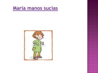 María era una niña descuidada que casi nunca se lavaba las manos. Vivía microbios en sus manos y frutas sin lavar que trataban de enfermarla. Un día, un gusano llamado Guillermo llegó a su estómago a través de una fruta y organizó una reunión con otros gusanos, haciendo que María se enfermara con diarrea y dolor estomacal. María fue al médico y se recuperó, aprendiendo la importancia de lavarse las manos y frutas para evitar enfermedades.