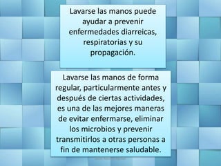 Lavarse las manos es crucial para prevenir enfermedades diarreicas y respiratorias, además de evitar la propagación de microbios. La técnica de lavado debe realizarse por al menos 15 segundos usando suficiente jabón y agua, siguiendo los pasos recomendados por la OMS. Es importante lavarse las manos antes y después de actividades específicas como comer, tocar a personas enfermas o manipular objetos públicos.