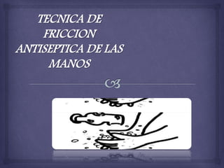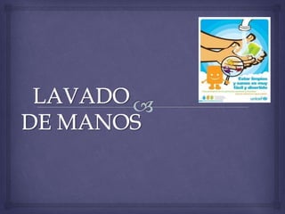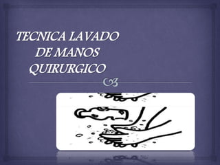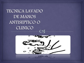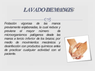 El documento proporciona información sobre los diferentes tipos de lavado de manos, incluyendo lavado antiséptico/clínico, lavado quirúrgico y fricción antiséptica. Explica que el lavado antiséptico/clínico se realiza con jabón antimicrobiano para remover la suciedad y reducir bacterias, mientras que el lavado quirúrgico usa jabón quirúrgico para eliminar completamente la flora bacteriana. También cubre los momentos para realizar cada tipo de lavado y las recomend