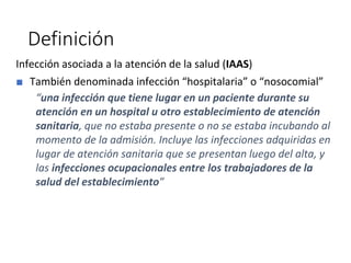 El documento describe las infecciones asociadas a la atención de la salud (IAAS), también conocidas como infecciones nosocomiales o hospitalarias. Las IAAS generan agravamiento de enfermedades, prolongación de estadías hospitalarias, discapacidad a largo plazo y mayor número de muertes. Se identifican los focos más frecuentes de IAAS como infecciones del tracto respiratorio, intravasculares, en el sitio quirúrgico y del tracto urinario. Finalmente, se enfatiza que el lavado de manos