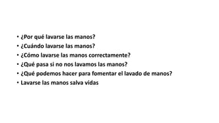 El documento explica por qué es importante lavarse las manos regularmente, cuándo se debe lavar las manos, cómo lavarlas correctamente, y los riesgos de no lavarse las manos. Lavar las manos con jabón y agua tibia durante al menos 20 segundos es clave para prevenir la propagación de enfermedades como la gripe, resfriados y diarrea. Lavarse las manos regularmente promueve la buena higiene personal y salud pública.