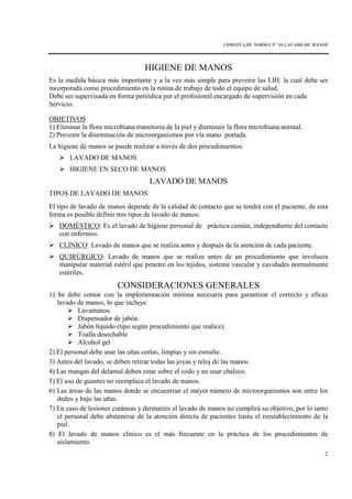 El documento describe la importancia del lavado de manos para prevenir infecciones, detallando los diferentes tipos de lavado (doméstico, clínico, quirúrgico). Explica que el lavado de manos debe realizarse antes y después de atender cada paciente, comer, ir al baño, y otros. Describe los pasos para un correcto lavado clínico y quirúrgico de manos, incluyendo el uso de jabones antisépticos. También cubre la higiene en seco de manos usando alcohol gel y recomendaciones para