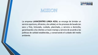 Este documento presenta la misión y objetivos de la empresa LAVACENTRO LINEA AZUL, la cual se dedica a prestar servicios de lavado en seco y frio, tintorería, planchado y servicio a domicilio. La empresa busca ser reconocida en 2019 como una de las mejores lavanderías de la ciudad a través de un servicio de calidad, productos excelentes y precios bajos, además de contribuir al cuidado del medio ambiente ahorrando agua. Sus principios son respeto al cliente, responsabilidad en la entrega