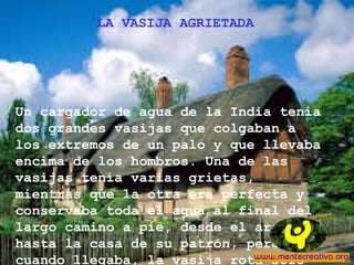 El resumen cuenta la historia de un aguador en la India que transportaba agua en dos vasijas, una perfecta y otra con grietas. A pesar de que la vasija agrietada solo podía transportar la mitad del agua, el aguador sembraba flores a lo largo de su camino para que la vasija las regara, decorando así el altar de su madre. El aguador le explica a la vasija que gracias a sus grietas pudieron crecer las bellas flores.