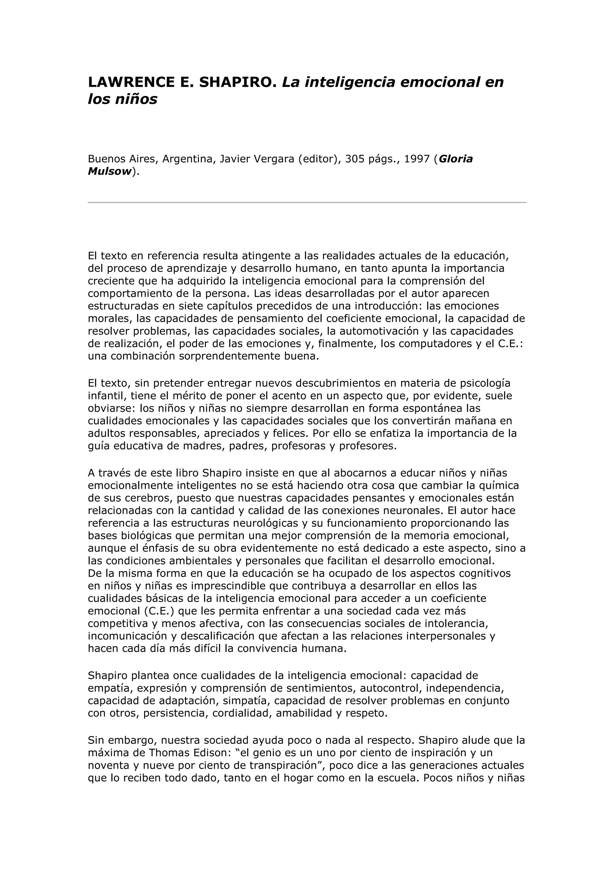 Este documento resume un libro sobre el desarrollo de la inteligencia emocional en los niños. El autor argumenta que las emociones son importantes para comprender el comportamiento humano y que los niños no siempre desarrollan habilidades emocionales de forma espontánea. Propone once cualidades de la inteligencia emocional como la empatía y la resolución de problemas. También sugiere estrategias como juegos y cuentos para guiar el desarrollo emocional de los niños.