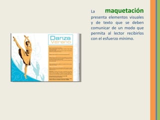 El documento habla sobre el layout o maquetación. Explica que el layout se refiere a la distribución y disposición de elementos visuales y de texto dentro de una publicación para que el lector pueda recibir la información con el mínimo esfuerzo. Luego menciona algunos ejemplos de técnicas de maquetación como la sección áurea, la cuadrícula simétrica y la cuadrícula asimétrica.