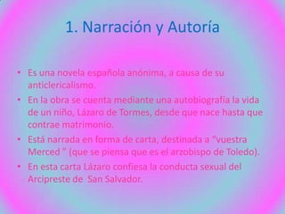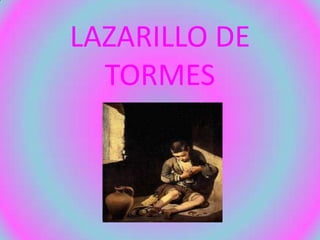 El resumen describe la estructura y contenido de la novela picaresca española Lazarillo de Tormes. Narra las desventuras de Lázaro mientras pasa hambre sirviendo a diferentes amos, incluyendo un ciego, un clérigo, un escudero arruinado y figuras religiosas como un fraile y un capellán. La obra critica la obsesión por el honor y la corrupción del clero a través de la avaricia e hipocresía de los personajes.