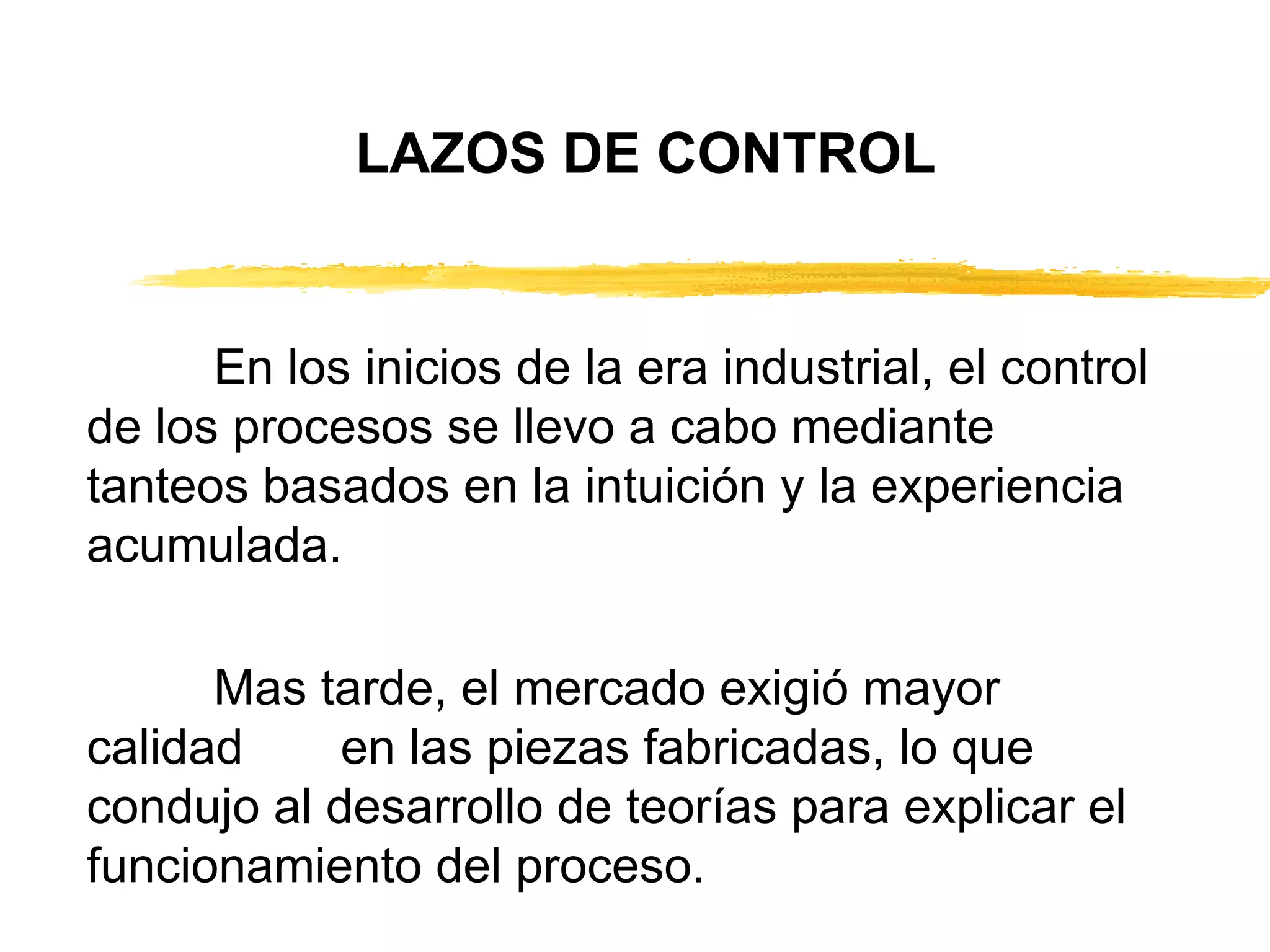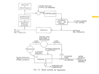 Este documento describe los diferentes tipos de lazos de control, incluyendo control todo-nada, lazo abierto, y lazo cerrado. Explica que el control de lazo cerrado usa un elemento de medición para comparar la variable del proceso con el punto de ajuste y ajustar la salida para mantener el proceso en el punto de ajuste. También describe los diferentes tipos de controladores, incluyendo proporcional, integral, derivativo y PID, y cómo cada uno afecta la salida.