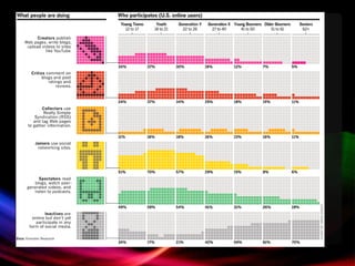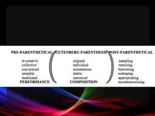 El documento analiza los cambios en los medios de comunicación y la educación debido a la transición del paradigma de escasez al de abundancia en la era digital. Discuten los conceptos de nativos digitales, inmigrantes y colonos digitales, y cómo la fuerza de los lazos débiles afecta la difusión de información. Finalmente, examina cómo el libro electrónico y el aprendizaje en línea están cambiando la era posterior a Gutenberg.
