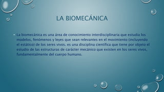 Este documento trata sobre la biomecánica. Explica que la biomecánica estudia el movimiento de los seres vivos y se estableció como disciplina en la segunda mitad del siglo XX. Se divide en biomecánica médica, deportiva y ocupacional. También cubre la biomecánica computacional, que simula sistemas biomecánicos complejos por computadora, y la tecnología biomecánica, que incluye dispositivos artificiales y técnicas de investigación.