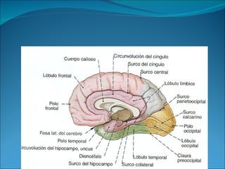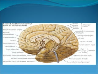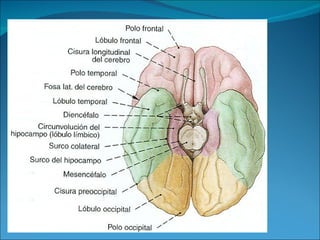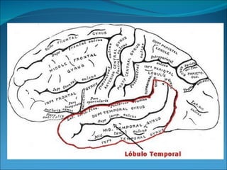 El documento describe las diferentes vistas y partes del lóbulo temporal y su localización funcional en la corteza junto con el lóbulo parietal.