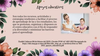 Los documentos tratan sobre varios temas relacionados a la educación inclusiva como apoyos educativos, atención sostenida, diseño universal para el aprendizaje, inclusión educativa, integración educativa, segregación, exclusión educativa y adecuaciones curriculares. También definen conceptos como discalculia, discapacidad cognitiva, neuroaprendizaje, neuroeducación, neurociencia, dislexia, déficit de atención e hiperactividad, espectro autista, discapacidad intelectual y alteraciones del lenguaje