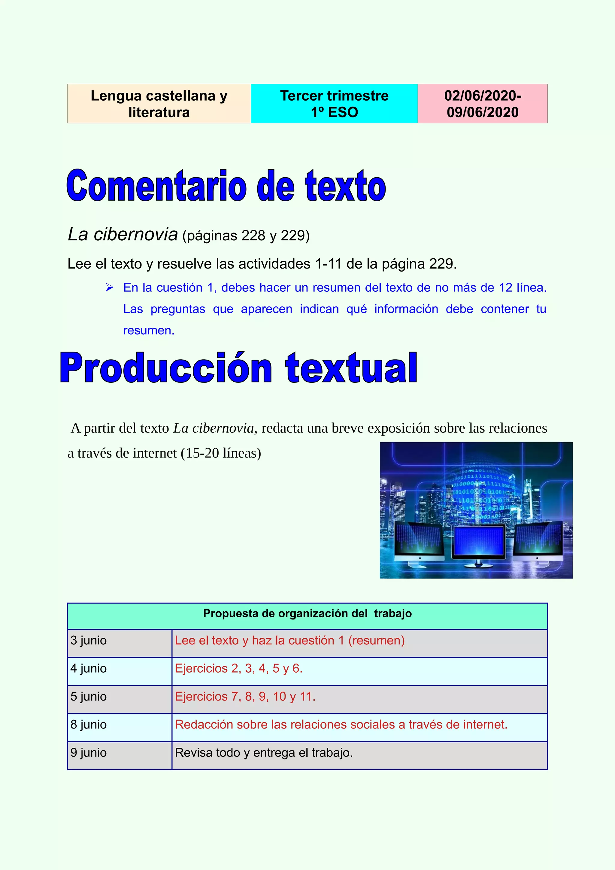 Este documento presenta las instrucciones para un trabajo sobre el texto "La cibernovia". Los estudiantes deben leer el texto y completar once actividades de comprensión lectora en varias fechas. También deben escribir un resumen de menos de 12 líneas y una breve exposición de 15 a 20 líneas sobre las relaciones a través de Internet. El documento proporciona una propuesta de organización para completar las diferentes partes del trabajo antes de la fecha límite del 9 de junio.