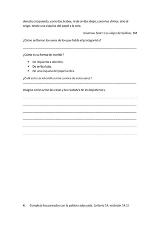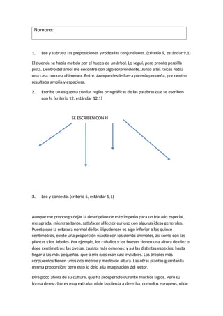 El documento contiene 9 preguntas de comprensión lectora y ejercicios de lengua española sobre temas como la identificación de preposiciones, conjunciones y palabras con h; la descripción de seres llamados liliputienses y sus características; la completación de poemas y cuartetos; y el uso de expresiones figuradas y la identificación de tipos de estrofa.