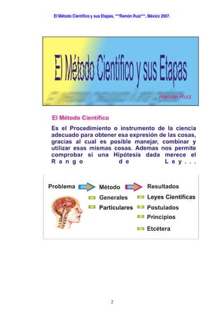 Este documento describe el método científico y sus etapas. Explica que el método científico sigue un procedimiento planificado para descubrir procesos objetivos en la naturaleza, comprender sus conexiones y generalizar conocimientos a través de la observación, experimentación, desarrollo de hipótesis y pruebas. También discute las diferentes concepciones del método científico y su relación con la teoría general subyacente. El documento fue escrito por Ramón Ruiz en 2007.